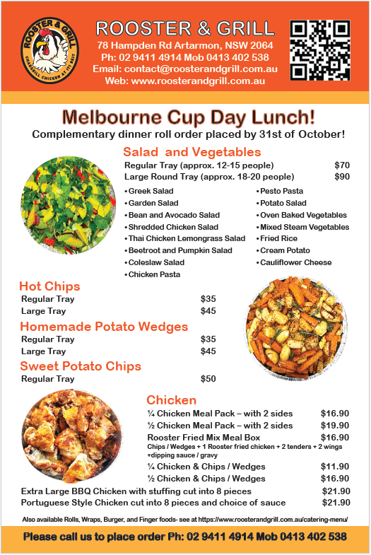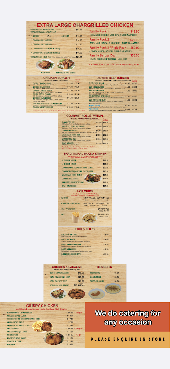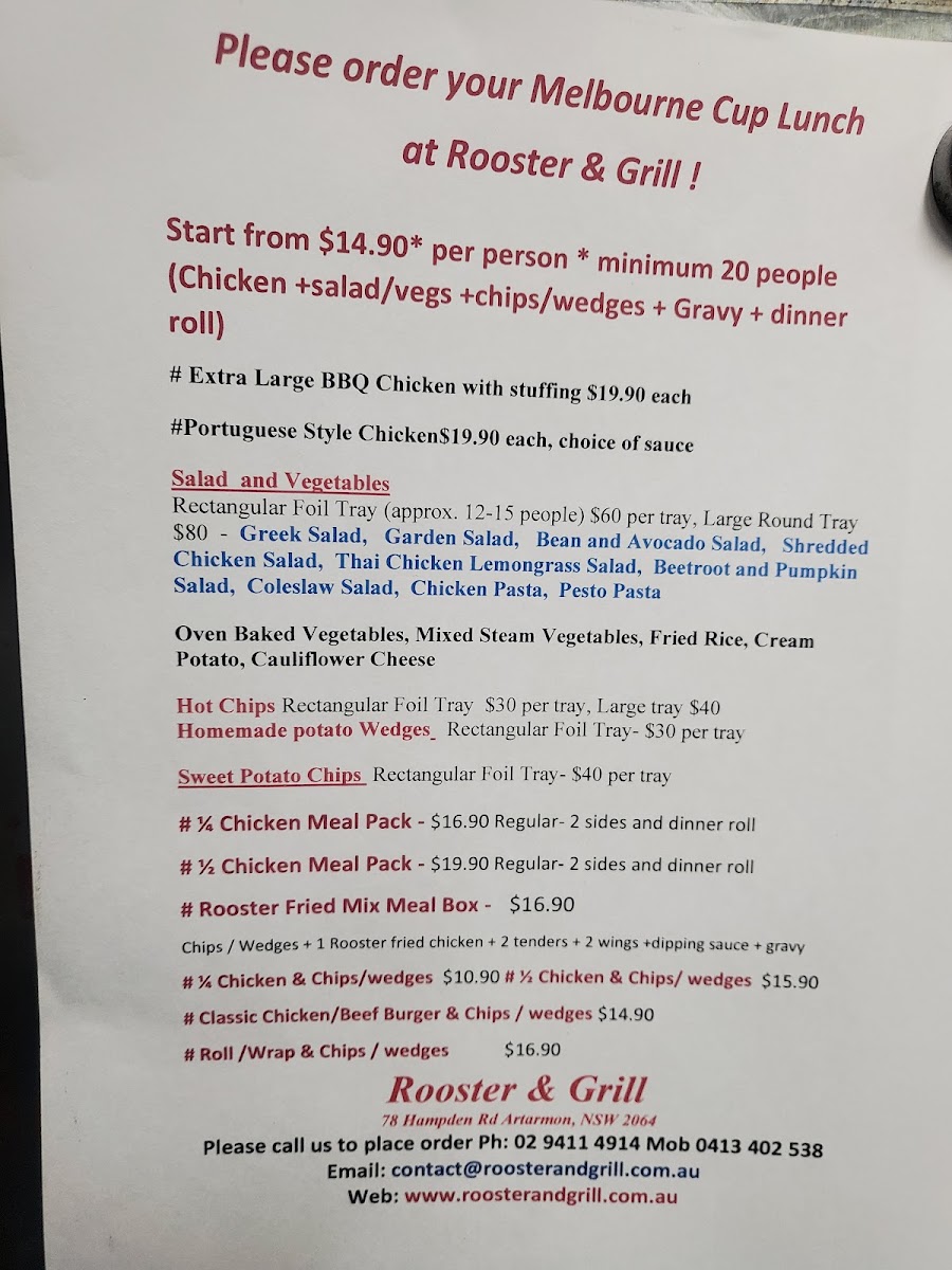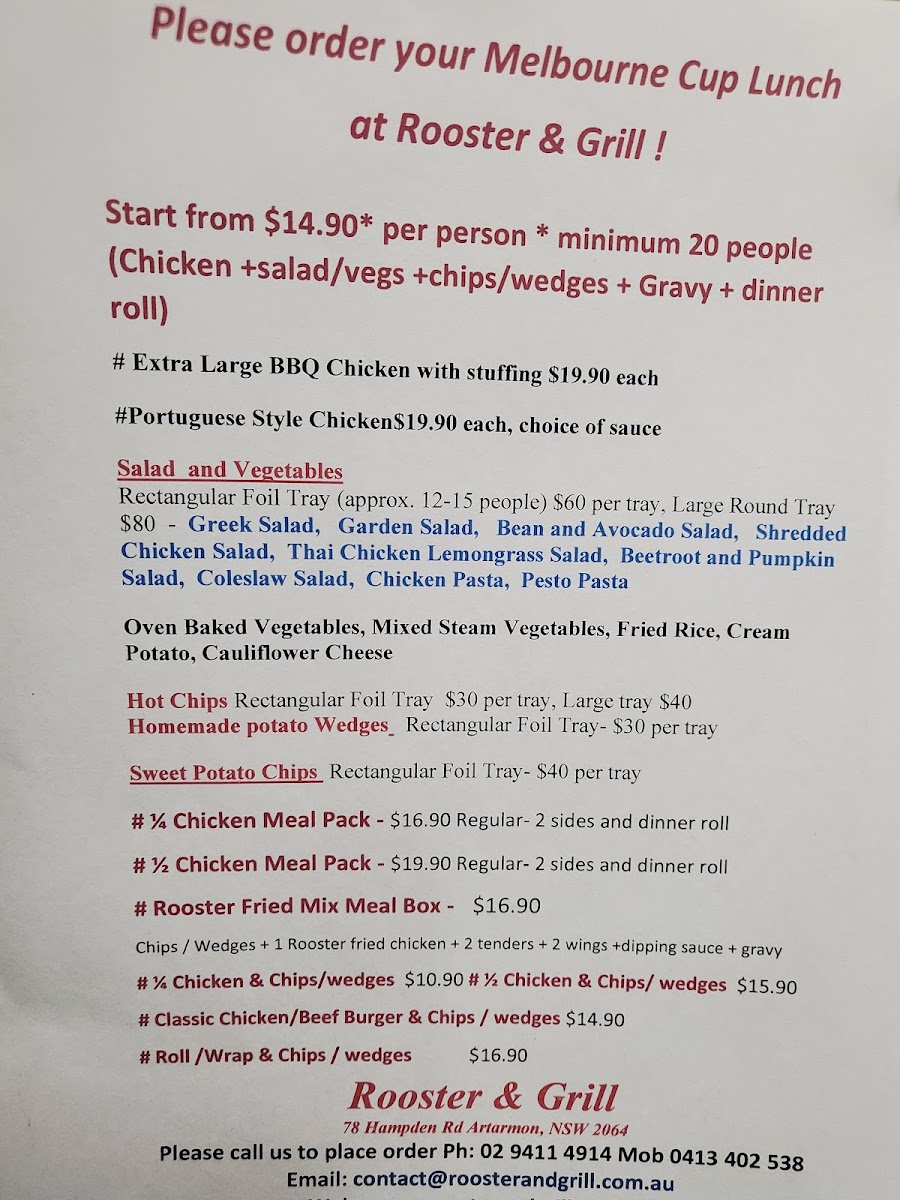 Introducing Rooster & Grill, your go-to takeout destination at 78 Hampden Rd, Artarmon. Known for its warm atmosphere and friendly service, this local gem excels in delivering comfort food that satisfies. The menu shines with an array of Aussie beef burgers, from the classic to the beef deluxe, each crafted with fresh ingredients and generous portions. Don't miss the hot chips and homemade potato wedges, seasoned to perfection with chicken salt.